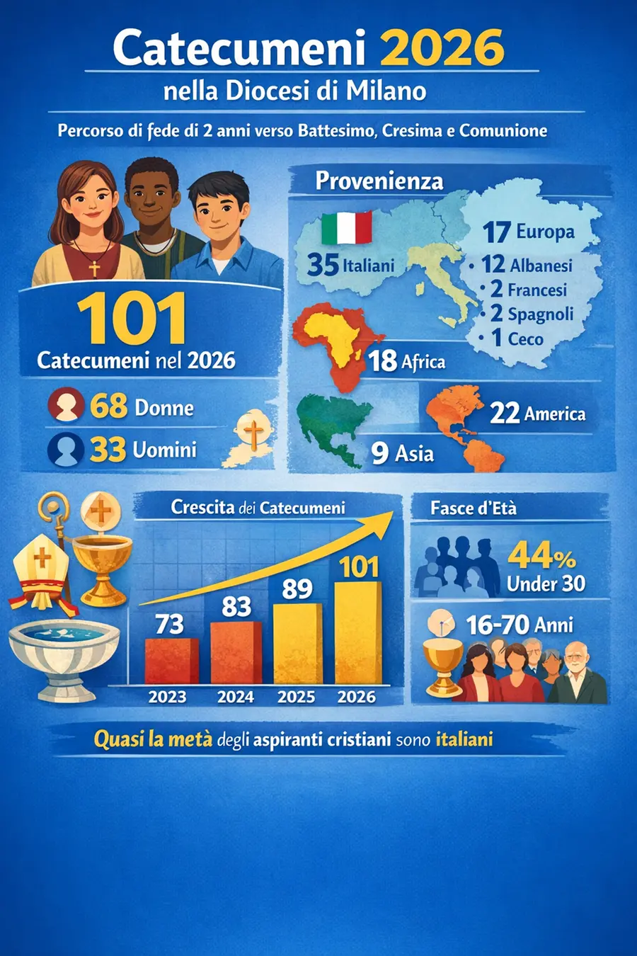 They are the catechumens of the Diocese of Milan – the largest in Italy and one of the largest in Europe – children aged at least 14, young people and adults who ask to become Christians after a two-year training journey. Saturday evening, in the Cathedral, during the Easter Vigil to receive the sacraments from the archbishop Mario Delpini they will be in 101: 68 women and 33 men, of which 35 are Italian and 17 from other European countries (12 Albanians, two French, two Spanish, one from the Czech Republic). The oldest is 70, the youngest is 16 but those under 30 are almost half, 44%.