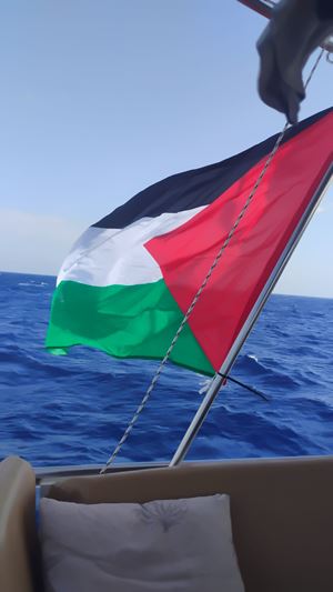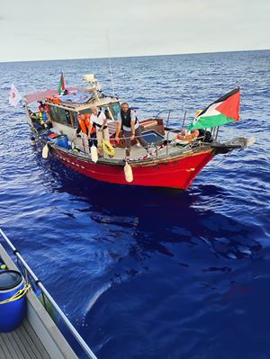 Meri Calvelli in the foreground on one of the boats of the Global Sumud Flotilla